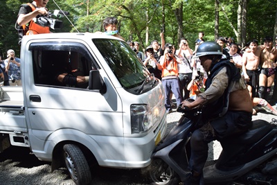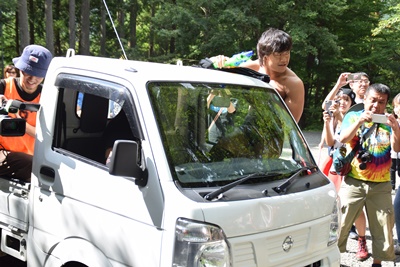 一方DAMNATIONは軽トラックを占拠、カメラマンを荷台に乗せたまま乗り回す(右写真)。