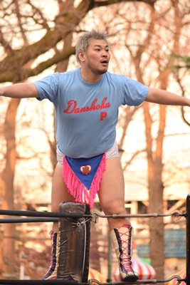 勝俣はヨシヒコと前の人を分離させる(左写真)。ヨシヒコ勝俣にバックドロップ。勝俣はMAOにタッチ。