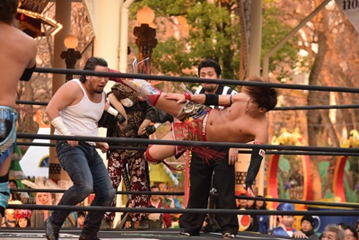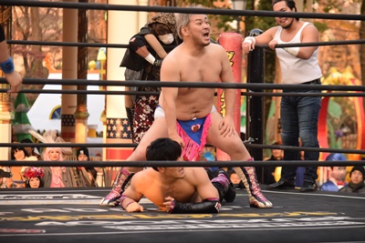 MAO男色ナイトメアの餌食に(右写真)。大石が入ってカット、ディーノMAOの顔面に座り込む、カウント2。5分経過。