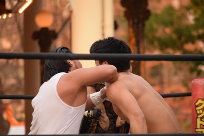 勝俣は主に前の人にエルボー打ち返す(左写真)。