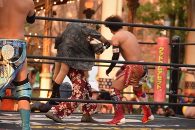 大家突っ込む、勝俣延髄蹴り(右写真)。勝俣ロープに飛ぶ、大家すくい上げてボディスラム、ヨシヒコにタッチ。