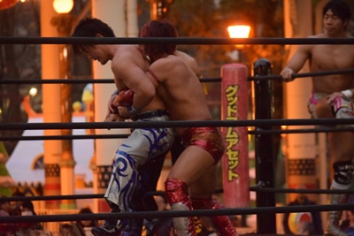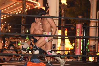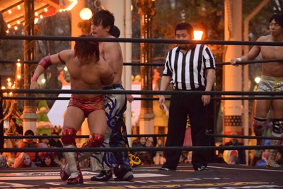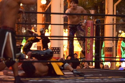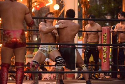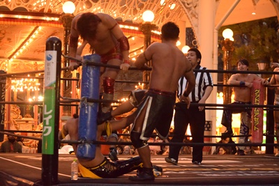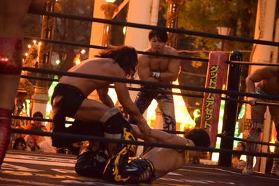 HARASHIMAとKUDOが入って串刺し攻撃に行くが彰人はかわして同士討ちを誘い、3人まとめてドラゴンスクリュー(右写真)。高梨にタッチ。