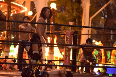彰人と高尾が入り、ハネ上げてダブルのニーリフト(右写真)。HARASHIMAが入り高梨にジャンピングハイキック、KUDOも彰人にバズソーキック。