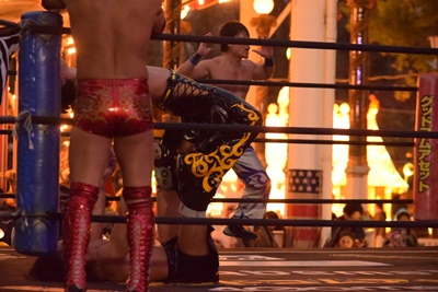 彰人ロープに飛ぶ、竹下カウンターのゼロ戦キック。ブルーサンダー狙うが、彰人は下から足を取ってアンクルホールド、そしてヒザ十字(右写真)、竹下ロープ。