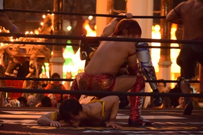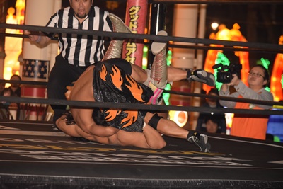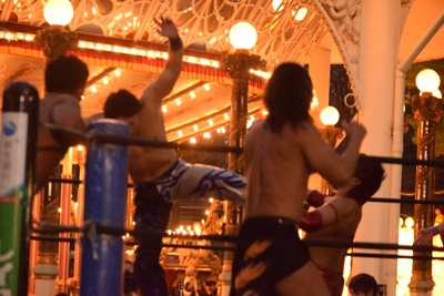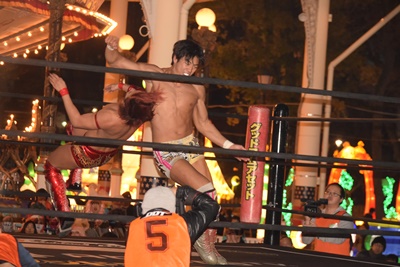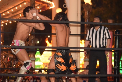十字架固めに(右写真)、カウント2。KUDOを自軍コーナーに連れ帰り高尾にタッチ。