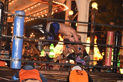 高尾エルボー(左写真)、コーナーに振ってジャンピングハイキック、コーナーに上ってHARASHIMAの背中にダイビングフットスタンプ。