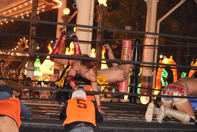 高尾KUDOにドロップキック(右写真)、HARASHIMAとKUDOは場外に。
