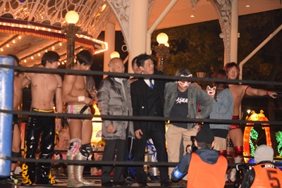 でいしろう氏、松田プロデューサー、サクセスの吉成社長もリングに上がって締め(左写真)。吉成社長この時は「4回目のコラボ」も示唆したが、その後「リング☆ドリーム」自体が終了してしまったので4回目はなし。