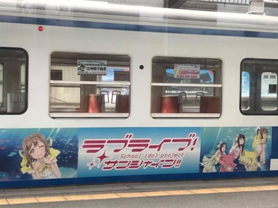 反対側のホームには「ラブライブ!サンシャイン!」のラッピング車両。