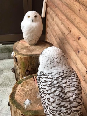 シロフクロウつがい。斑紋があるのがメスなのだそうだ。