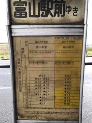 駅に戻るべくバス停に。当然のように降りたのと反対側のバス停に地下道を通って行くが、そのバス停の表示に該当の便がない。あれ?NAVITIMEで見てもその便は普通に出てくる。ふとこの路線が「循環」であることを思い出し、降りたバス停に行くと載ってた。しかもこっちには「午前中は反対側」と注意書きが。向こうにも書いといてくれよ・・・。