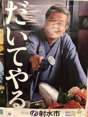 22時20分高岡発のあいの風とやま鉄道で富山駅に戻る。駅貼ってあったポスター。「だいてやる」とは「おごってやる」の意味だそうだ。写真UPは途中でやめて寝る。
