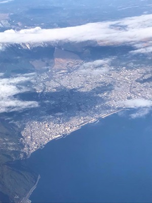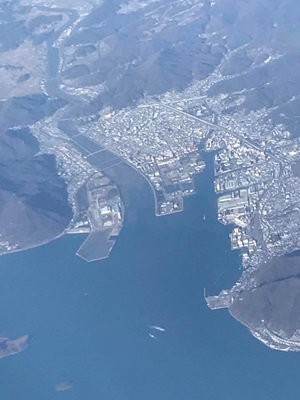 飛行機の中でもまた寝る。起きて窓の外を見る。富士山はすでに通過。また寝て起きる。「名古屋辺りかな?」と思ってWi-fi(JALは無料なのでやっぱりJALがいいや)の飛行経路図を見るともう岡山辺りだった。写真は尾道上空。