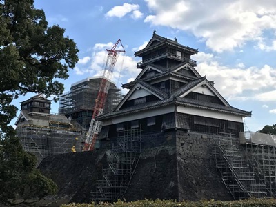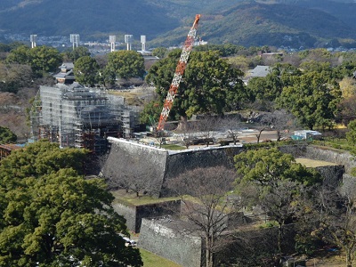 昼飯も食ったので市電で熊本城に向かう。と言っても現在熊本城は本丸外周を回る見方しかできないので、まずは市役所14階の展望ロビーに。うーんやっぱりひどい壊れようだなあ。