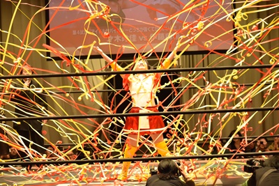 黄色と赤の紙テープが飛ぶ(左写真)。
