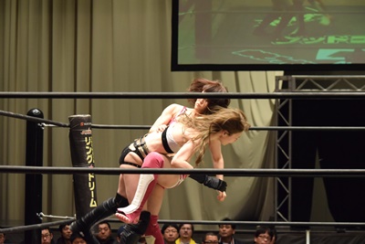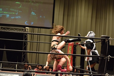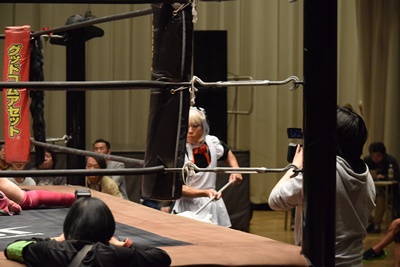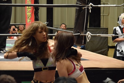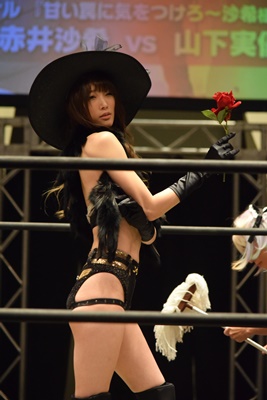 挑発された山下がコーナーに突っ込んでいくが沙希様はかわしロープに詰める(右写真)