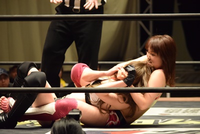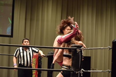山下はロープをつかんでブロックする沙希様を強引にぶっこ抜いてジャーマン(右写真)