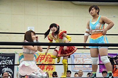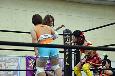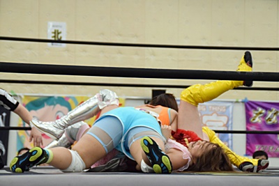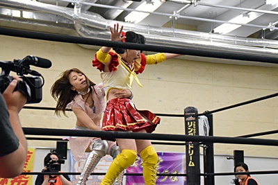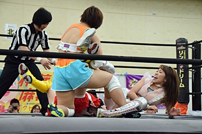 実況してたあずにゃんがリングに飛び込んでカバー、優宇が蹴ってカット(右写真)。