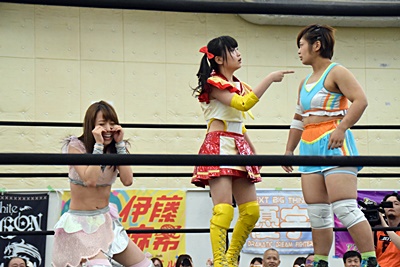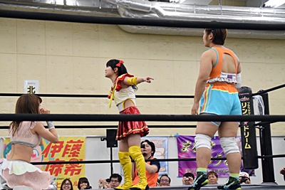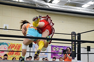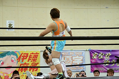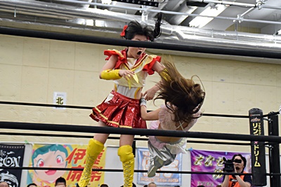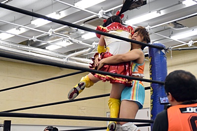 優宇伊藤ちゃんをコーナーに振る、伊藤ちゃん切り返して串刺しエルボー、優宇キャッチして(右写真)、