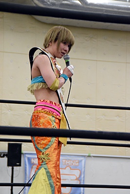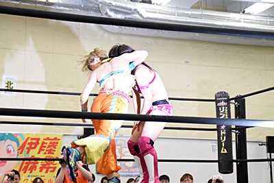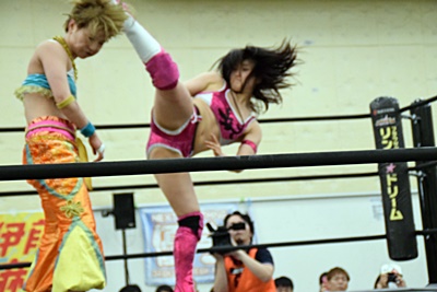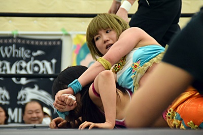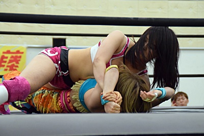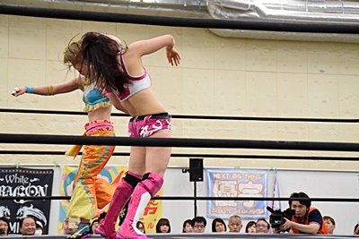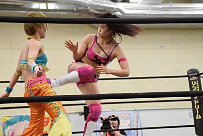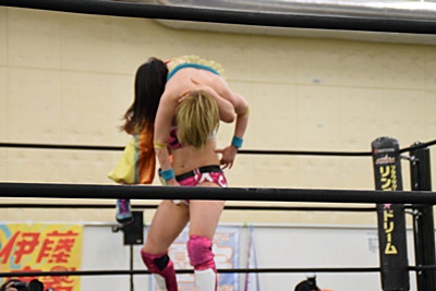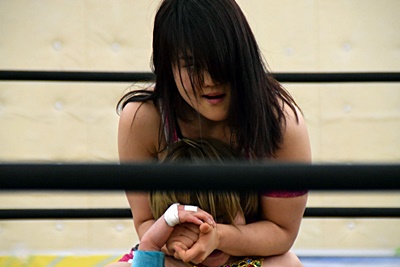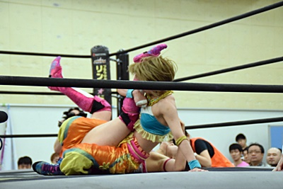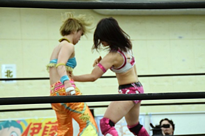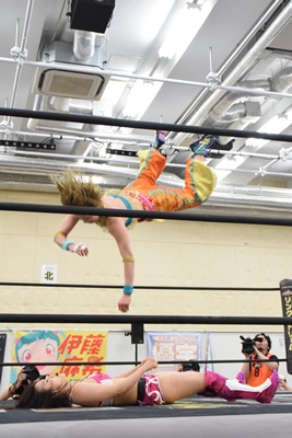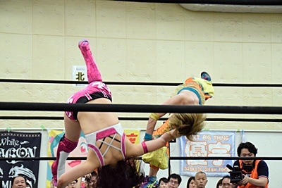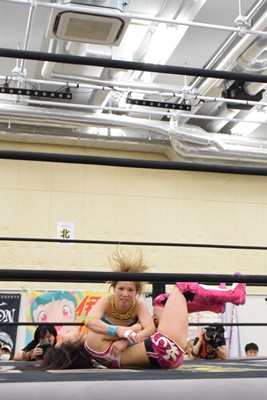 ユカッチトップロープから魔法少女スプラッシュ(左写真)、山下かわす。15分経過。