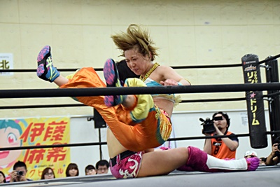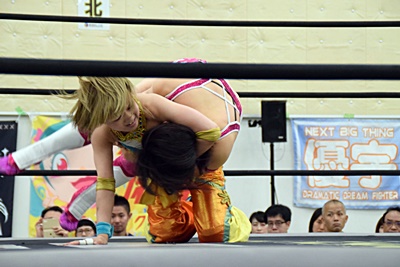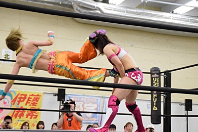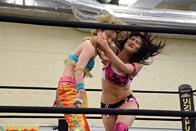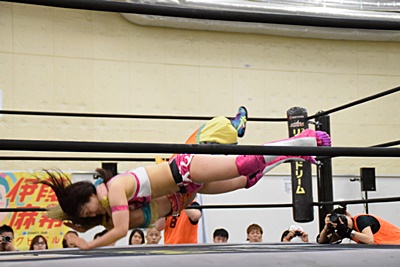 ユカッチ首を抜いてまたフライングメイヤー(右写真)、山下またヘッドシザーズ、ブレーク。
