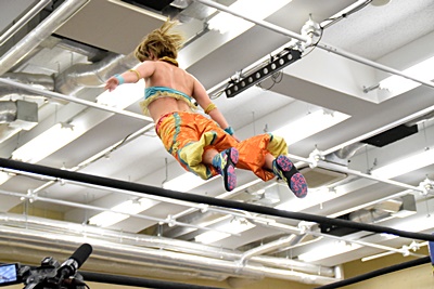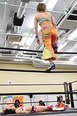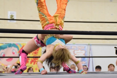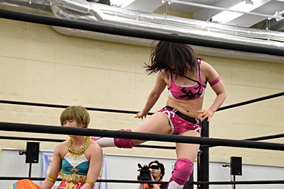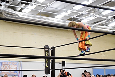 ユカッチトップロープに足を掛けて魔法少女スプラッシュ狙う(右写真)、