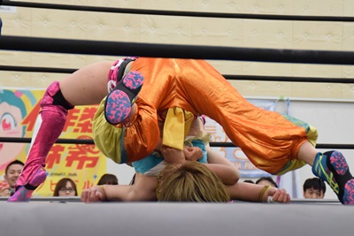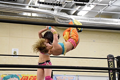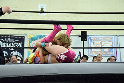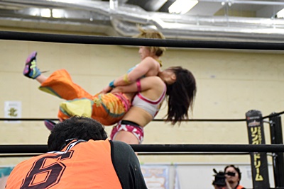 ユカッチ切り返してヘッドロックからフライングメイヤー(右写真)、