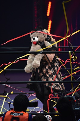 ステージにクマのぬいぐるみ”シャルロッテ”が現れる(左写真)