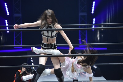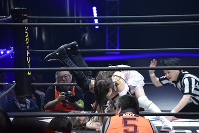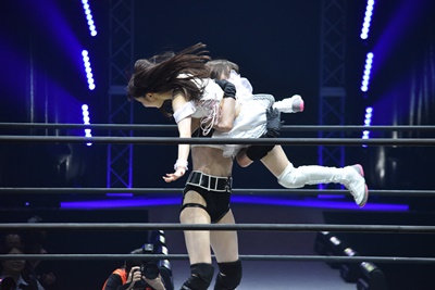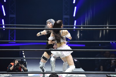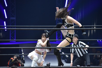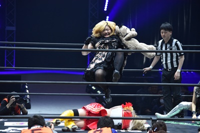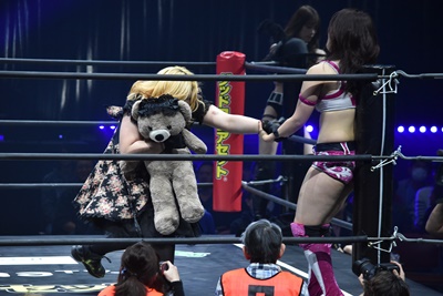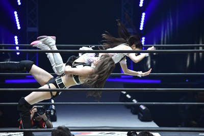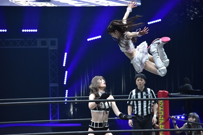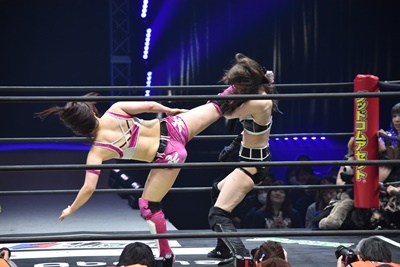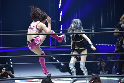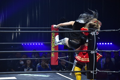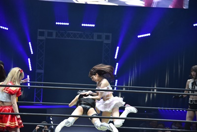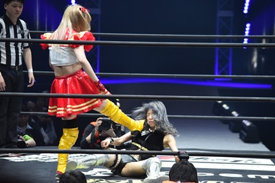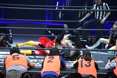 みずぴょん沙希様のハイキックをかわしてロープに飛ぶが、沙希様はフラップジャックに(右写真)。カバー、伊藤がカット。