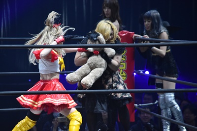 世志琥様山下をコーナーに振ってシャルロッテと一緒に串刺しラリアット連発(左写真)