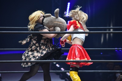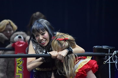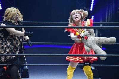 みずぴょんカニばさみで沙希様をロープに突っ込ませると背後からドロップキック(右写真)。