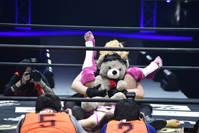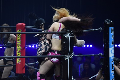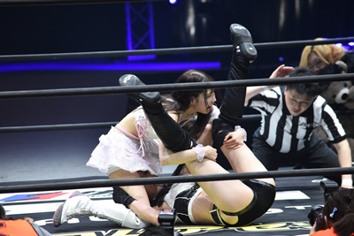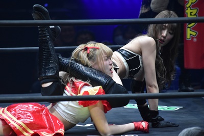 シャルロッテと一緒にエビ固め(右写真)、カウントは2。沙希様にタッチ。