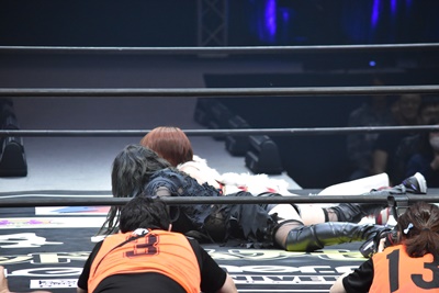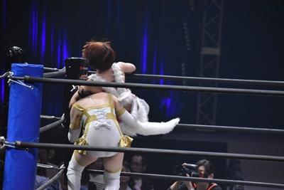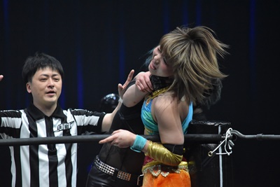 リカにダブルの619狙うがまほが未然に阻止、さらにリング内から場外にスライディングしつつロープにつかまったユカッチのバックを取り(左写真)