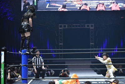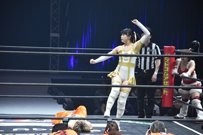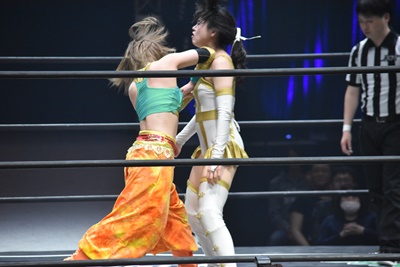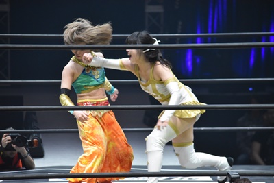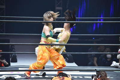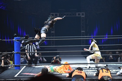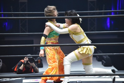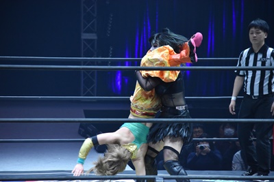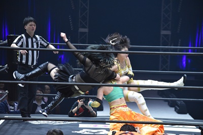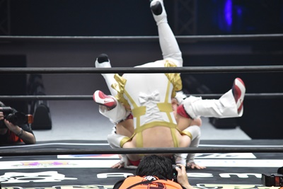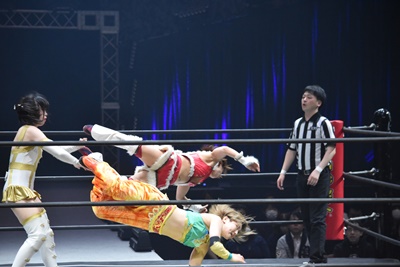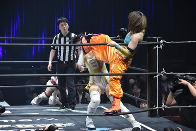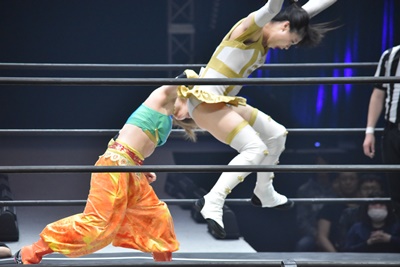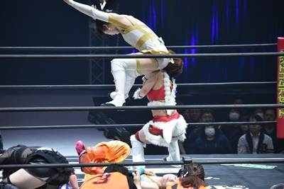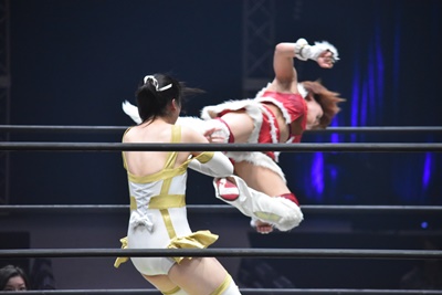 リカドラゴンバックブリーカー狙う、ユカッチ着地。リカガットショット、ロープに飛ぶ、ユカッチかわしてドロップキック(右写真)、中島にタッチ。