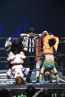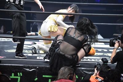 ユカッチ自力でロープエスケープ目指すが、まほがロープを引っ張って妨害(左写真)。それでもなんとかユカッチエスケープ。