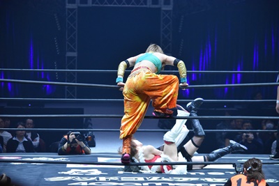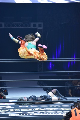 ユカッチ蹴って距離を開けるとダイビングヒップドロップ(左写真)。