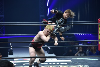 ロープの間から顔を出したところに彰人がドロップキック(右写真)、