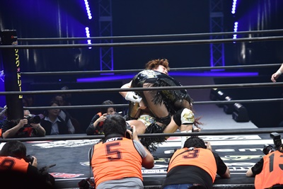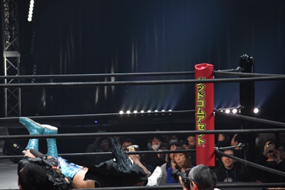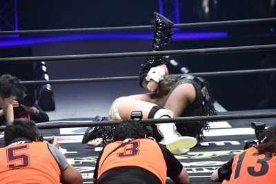 大石が平田にミラクルエクスタシー、平田背後に着地(左写真)。