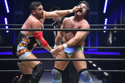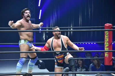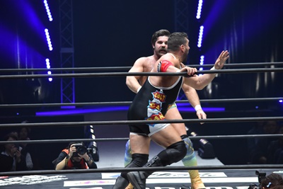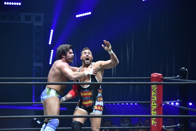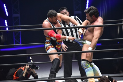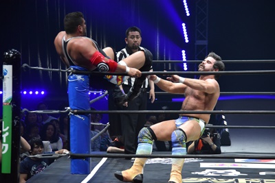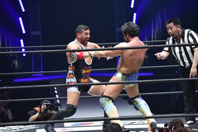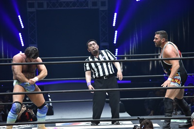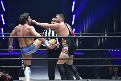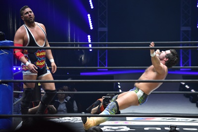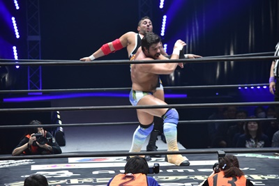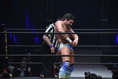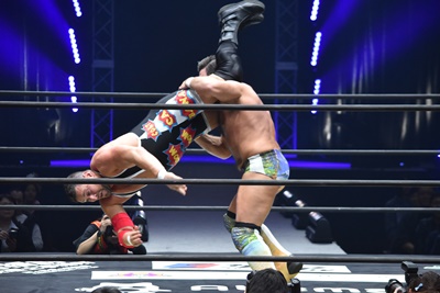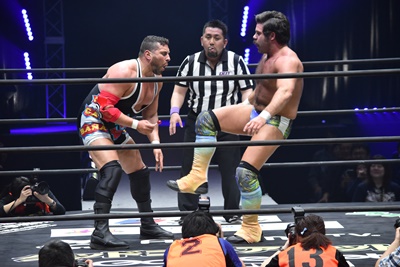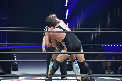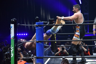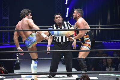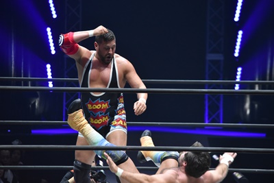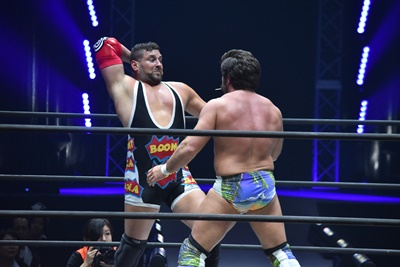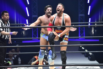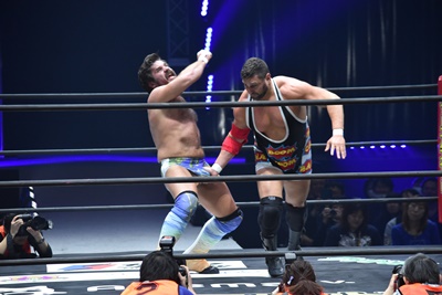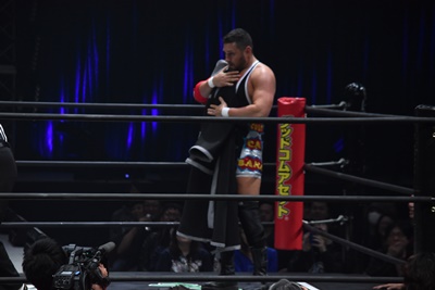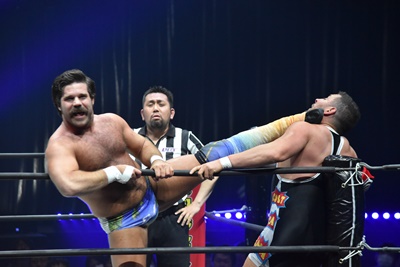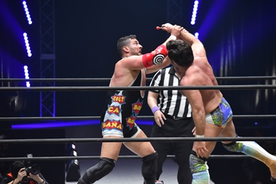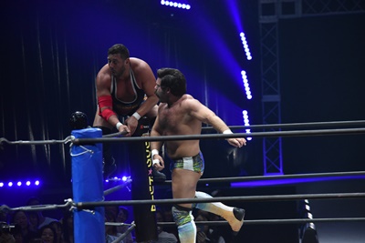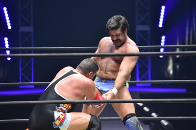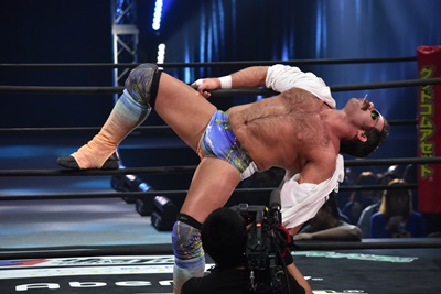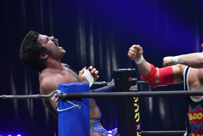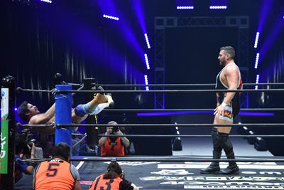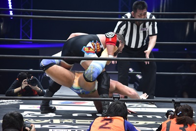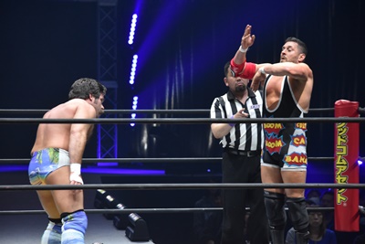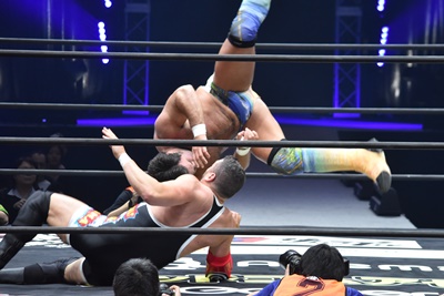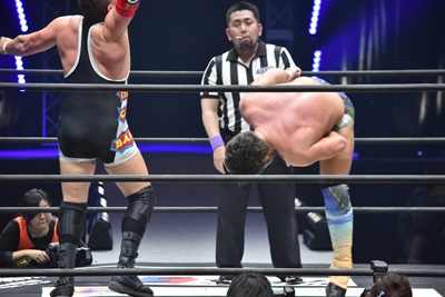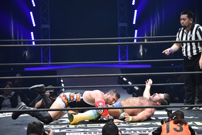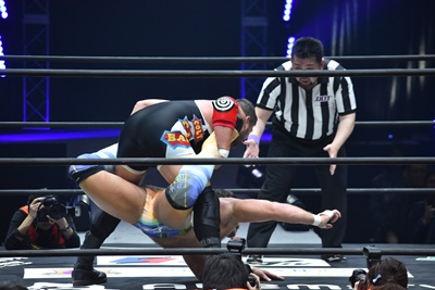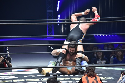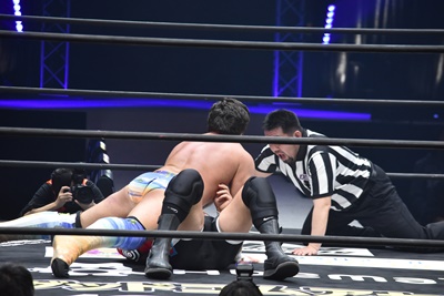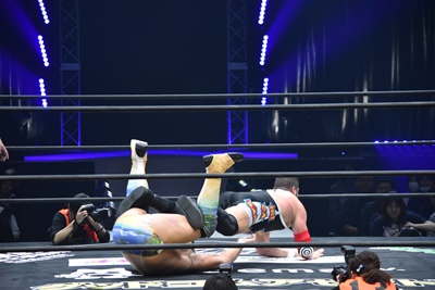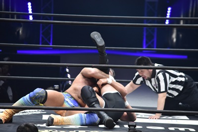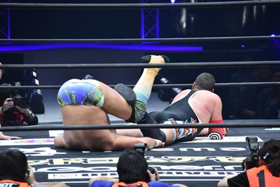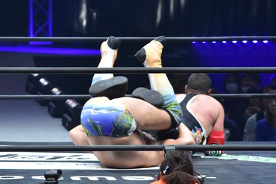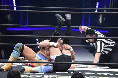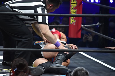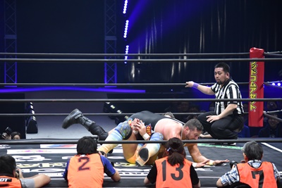 ならば、と両足取ってエビ固め(右写真)、カバナ2で返す。5分経過。