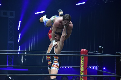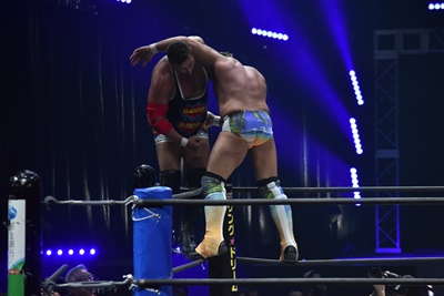 自分もコーナーに上って雪崩式ブレーンバスター狙う(右写真)