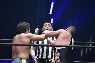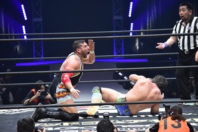 「もう6カウントも入った」と主張するライアン(左写真)。