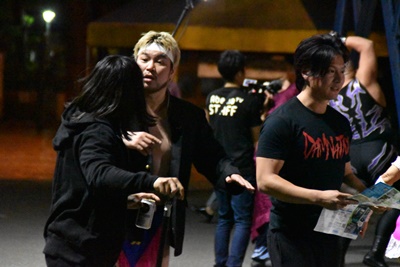 バイキング横の広場でくつろいでいるDAMNATIONが(左写真)。
