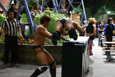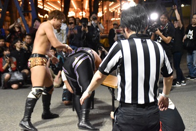 遠藤がポーリーをテーブル上に「伏せ」させて、その背中からケブラーダ(左写真)。