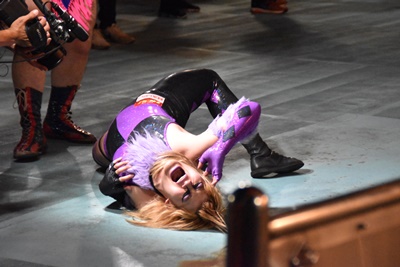 そしてもう一人の入場テーマが流れるとカサンドラが「この曲はー!心の傷がー!」と叫びながら地面にのたうち回って苦悩(左写真)。