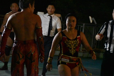 最後の一人はセンダイガールズの総帥・里村明衣子であった(左写真)。
