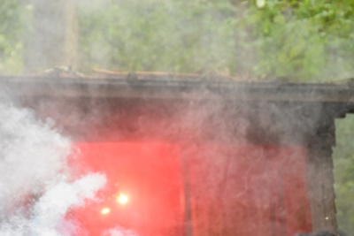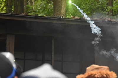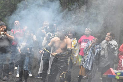 その頃スタート地点の広場ではキャンプファイヤーに点火(右写真)。70分経過。