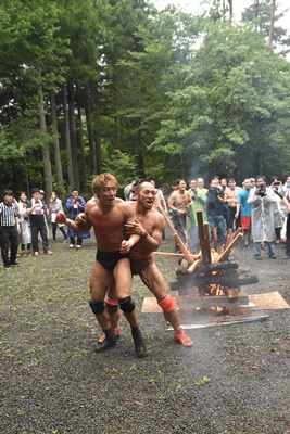 キャンプファイヤーを背に再度マイケルが上野を捕まえる(左写真)、