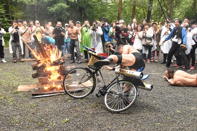 ドラマチック・ドリーム号をキャンプファイヤーに突っ込ませる(右写真)
