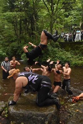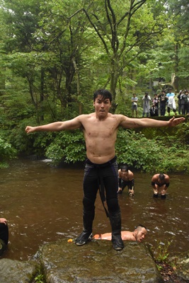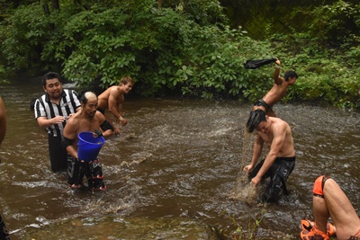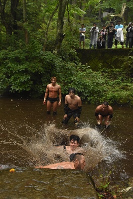 池の中でさらに水を掛けあう(右写真)。