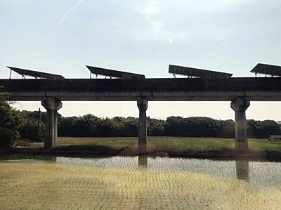 都農で異様な光景。あ、リニア実験線の跡か。今はソーラーパネル置き場に。壊すのも金かかるだろうからなあ・・・。